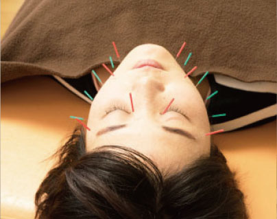 極細のはりを使い、表情筋のツボ(経穴)を刺激します。リフトアップ効果や血行促進で顔色を1トーン明るく。お顔のゆがみ改善などにも